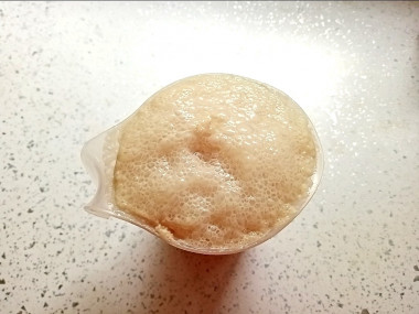 За указанное время дрожжи должны активироваться, на поверхности смеси появится шапочка из дрожжевой пены. Если этого не произошло, то дрожжи придётся заменить. В отдельной миске взбейте вилкой или венчиком куриное яйцо до однородной по консистенции. Сливочное масло растопите в микроволновой печи и остудите до комнатной температуры.