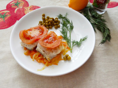 Крупный помидор вымойте, удалите плодоножку и нашинкуйте полукольцами. На подушку из моркови и лука выложите размороженные кусочки филе минтая. И распределите поверх рыбы ломтики томата.
