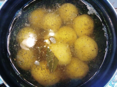 В кастрюле вскипятите воду. С выбором идеальной кастрюли поможет статья о кастрюлях, ссылка в конце рецепта. Воды должно быть достаточно, чтобы она полностью покрыла картофель. Выложите в кипящую воду картофель, половину измельченной зелени и лавровый лист. Доведите воду до кипения. Если у вас картофель твердых сортов, то можно добавить в воду 1 ст. л. растительного масла. А если картофель из рассыпчатых сортов, то лучше добавить совсем не много уксуса.