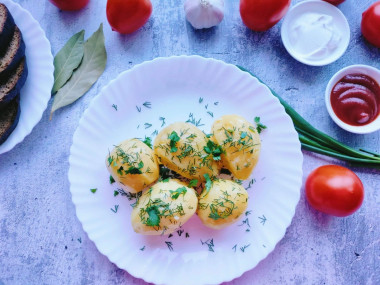 Картошку отварила на гарнир к котлетам. Необычным стало отваривание с добавлением укропа и лаврового листа. Лавровый лист взяла маленький, побоялась, что картошка будет горчить. Укропа свежего у меня не было, использовала сушеный. Свежий, конечно, был бы предпочтительней. Тем не менее картошка получилась более вкусной и ароматной, чем если ее просто в воде отварить. Сливочное масло всегда подходит к картошке в любом виде, она придает нежный сливочный вкус. Гарнир зашел на ура) Все в восторге. Мне понравилось просто с домашним кетчупом. Раньше не очень любила отварную картошку именно из-за вкуса. Теперь с этим проблем не будет. Думаю можно добавлять еще что-то для ароматизации, типа лука, чеснока, петрушки. Спасибо большое за идею!