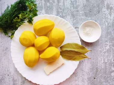 Картофель очистите и обмойте. Очищенный картофель лучше положите в холодную воду, чтобы он не потемнел. Следите, чтобы он находился в ней не очень долго, так как из-за этого мякоть картофеля грубеет и теряет некоторое количество крахмала. Картошку при желании можно нарезать кубиками или ломтиками. Я варила целиком.
