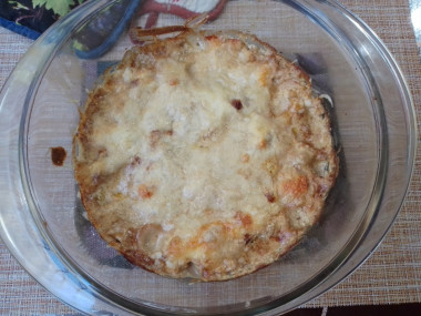Сверху сметанка и немного майонеза, да присыпать тертым сыром и в духовку. Через 30-40 минут замечательный ужин готов)))