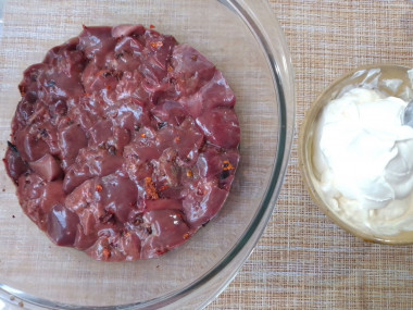 Печень тщательно промойте, удалить лишний жир. Печень лучше замочить на 30 минут в холодной воде, чтобы отбить специфический запах. Затем обсушите печенку, посолите, поперчите.
