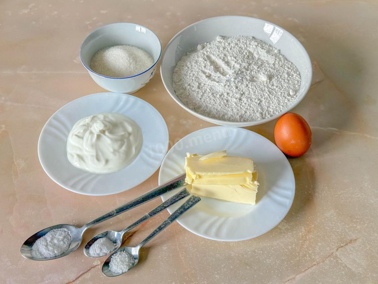 Подготовьте ингредиенты по списку. Начните с приготовления теста, так как его надо будет охладить. Сливочное масло заранее достаньте из холодильника, чтобы оно размягчилось при комнатной температуре. Муку пшеничную смешайте с содой и просейте в миску, чтобы избавиться от примесей и насытить её кислородом. О правильной замене соды на разрыхлитель читайте в статье под рецептом.