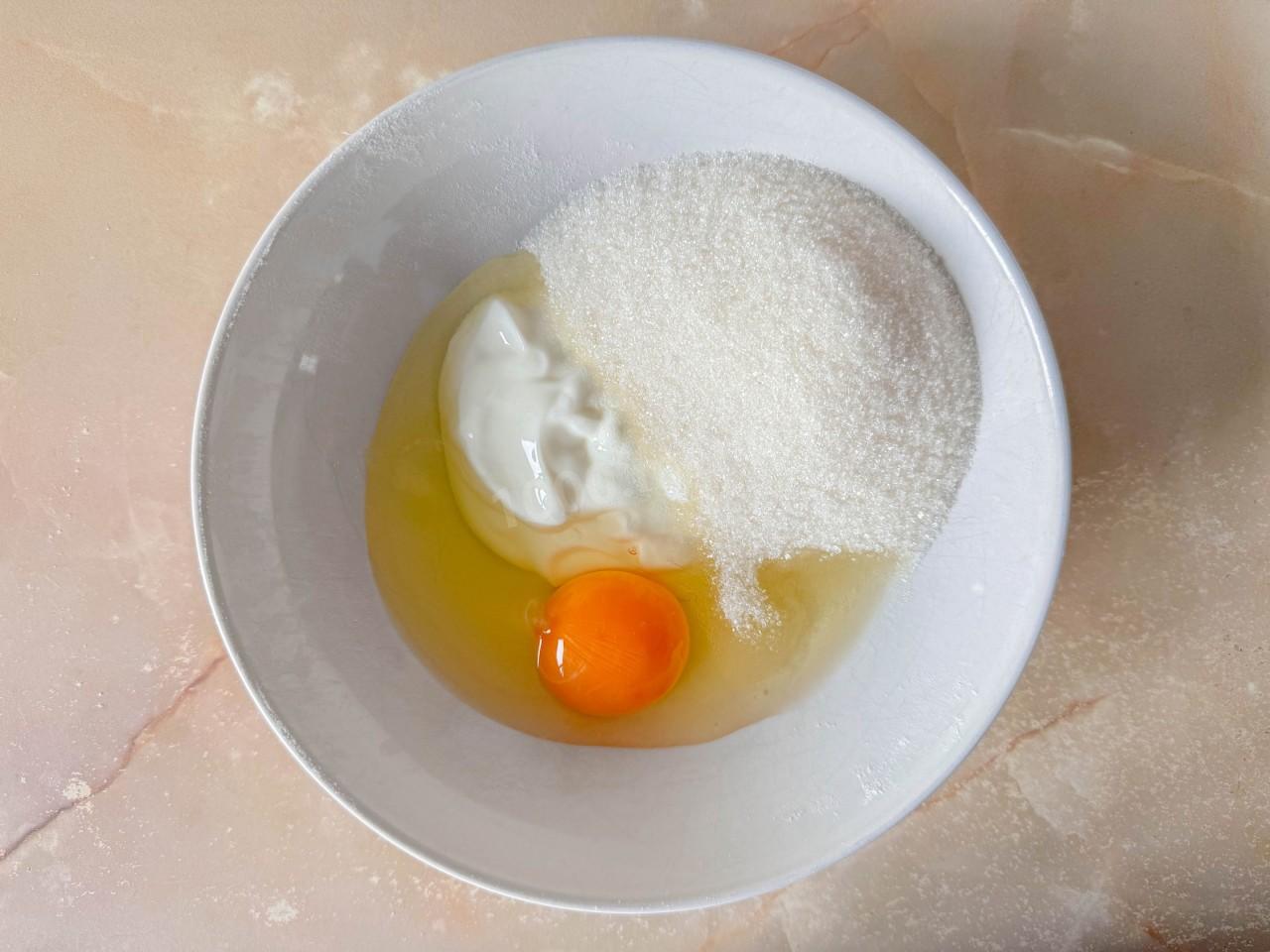 В другой миске соедините яйцо, сахар, сметану, соль и ванильный сахар. Все компоненты тщательно перетрите до полного растворения кристалликов сахара. Ванильный сахар можно заменить на ванилин, как правильно это сделать читайте в конце рецепта.