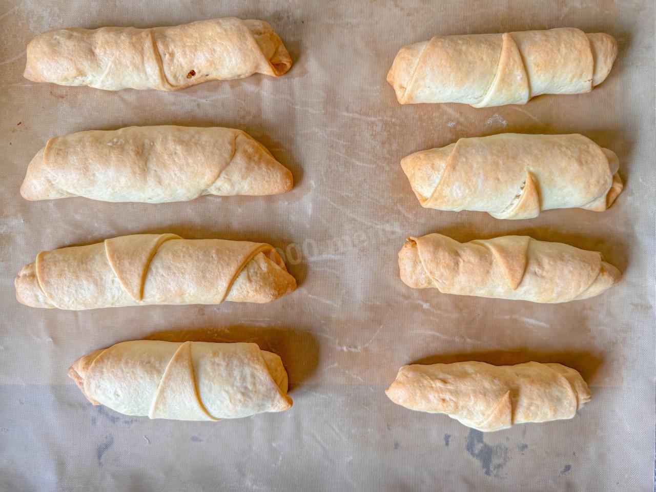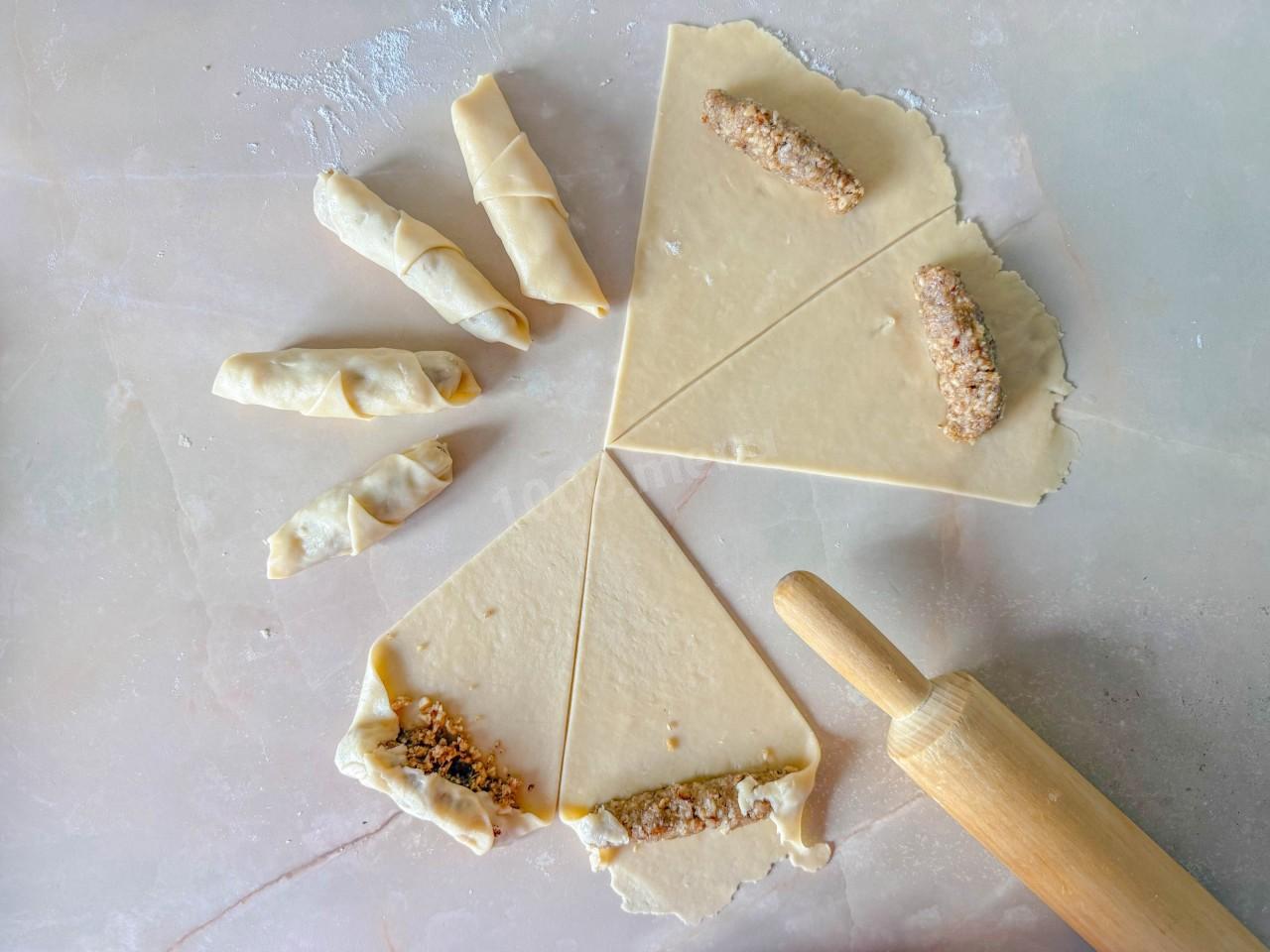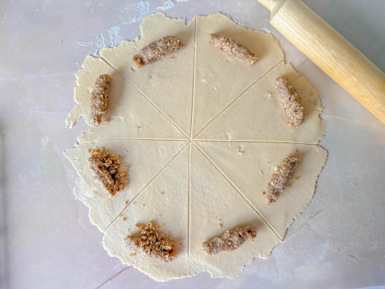 Достаньте тесто из холодильника и разделите его на 2 части. Одну часть снова отправьте в холодильник, а вторую раскатайте в тонкий круглый пласт, толщиной 5-8 мм. Разделите на 8 частей по подобию пиццы. Я использовала круглый нож для пиццы. У основания каждого кусочка выложите столовую ложку начинки. Если начинка липкая и податливая, то можно сразу сформировать из нее ровную палочку, так изделия получатся еще более ровными и презентабельными.