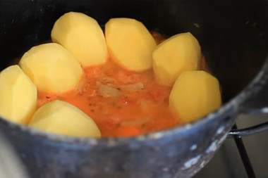Картофель очистите, с баклажана срежьте места крепления плодоножки. Нарежьте картофель и баклажан крупными кусочками. Помидоры ополосните и разрежьте на 4-8 частей. Добавьте всё в казан.