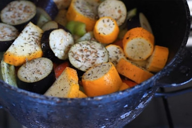 Время от времени открывайте крышку и проверяйте готовность картофеля и фасоли. Возможно вам потребуется чуть меньше или наоборот больше времени для приготовления. Когда рагу будет готово, откройте крышку казана и оставьте рагу над тлеющими угольками на 5-10 минут, чтобы блюдо напиталось ароматами костра. Посыпьте всё мелко нарезанной зеленью.