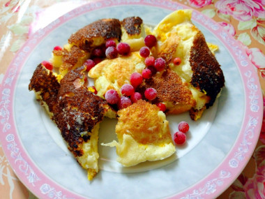 Тесто для кайзершмаррна получается воздушное и мягкое, настоящее облачко. Запекала его в сковороде диаметром 28 см. Кайзершмаррн я перевернула примерно через 3 минут после того, как вылила на сковороду тесто. Правда, он немного поломался. Но, поскольку готовый десерт надо разделить на кусочки, этот недочет был не заметен.