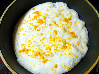 Возьмите сковородку, поставьте её на средний огонь. Выложите на сковороду кусочек сливочного масла, растопите его и, когда оно запенится, налейте на сковороду тесто. На поверхность теста выложите вымоченный изюм, цедру апельсина и лимона. Если вы используете маленькую сковородку, то придется испечь кайзершмаррн в два захода.