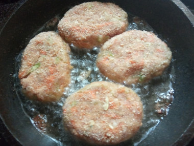 Руками сформируйте небольшие котлеты и обваляйте их в панировочных сухарях. На горячую сковороду налейте немного растительного масла и выложите котлеты. Обжарьте их пару минут на среднем огне до золотистой корочки.