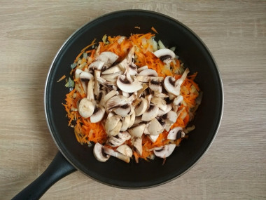 Лук и морковь очистите от кожуры и ополосните от загрязнений. Лук нарежьте, а морковь натрите на терке. Выложите лук и морковь в сковороду к грибам и обжаривайте все вместе еще 3-4 минуты. Овощи станут мягче.