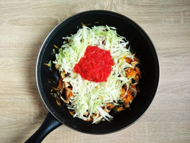 Вылейте томатный соус в сковороду к капусте. По вкусу добавьте соль и специи. Все перемешайте. Тушите капусту с грибами под крышкой еще минут 15.