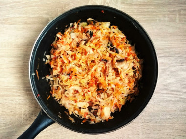 Для приготовления ужина воспользовалась рецептом свежей тушеной капустой с грибами, как раз в наличии оказались все необходимые продукты (только томатную пасту заменила свежими помидорами), да и сочетание грибов и капусты мне как раз по душе. Но капусту я не стала тушить отдельно, а добавила её в общую сковороду к овощам. Тушила до полуготовности капусты, а потом подержала с закрытой крышкой ещё минут 15. Из специй у меня лавровый лист и немного черного молотого перца. Просто вкуснятина получилась! Очень понравилось такое блюдо!