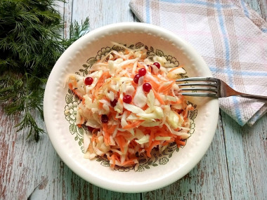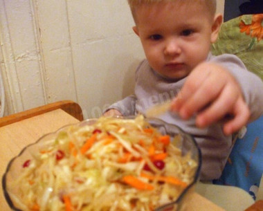 У меня сейчас много капусты, которую нужно срочно переработать, поэтому ищу на сайте интересные рецепты. Нашла рецепт квашеной капусты с клюквой. Вот это точно необычно для нас). Процесс мне знаком с детства. Помню родители перетирали капусту и морковь с солью в огромных тазах. Я же попросила помощи у сына. Сначала он перетер капусту с солью, а затем добавили морковь и клюкву. Всю эту массу я уложила в три пол литровые баночки, сверху добавила ягод клюквы. Банки стояли на столе сутки, рассол не появился, видимо капуста не того сорта. Поэтому сварила немного рассола с ложкой сахара и залила в банки. Через два дня капуста стала кисленькой, при этом рассол не помутнел. Видимо клюква сработала). Ещё два дня капуста стояла в холодильнике. Результат понравился и мне и мужу. Заправила салат растительным маслом и подала к мясным котлетам. Капуста получилась именно квашеной, с характерным кисловатым привкусом. Кисло-горькая клюква отлично сочетается с капустой, приятное послевкусие.