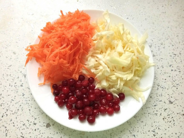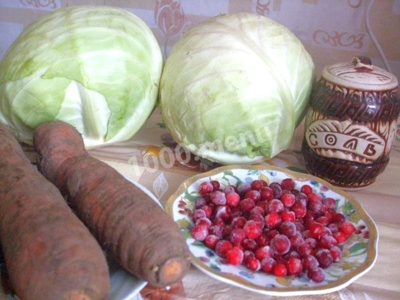 Подготовьте необходимые ингредиенты. Тщательно промойте морковь жёсткой щёткой. Кочан капусты ополосните водой и снимите верхние повреждённые или увядшие листья. Также удалите верхние зелёные листья - они могут придать готовому блюду горьковатый привкус. Клюкву переберите, промойте и обсушите (если замороженная - не размораживайте).
