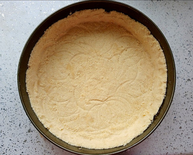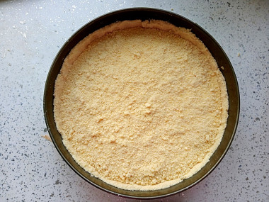 В застеленную пергаментом форму для выпекания диаметром 20-21 см (у меня вместо разъемной формы кулинарное кольцо) высыпьте большую часть крошки, примерно 3/4. Сформируйте дно и бортики.