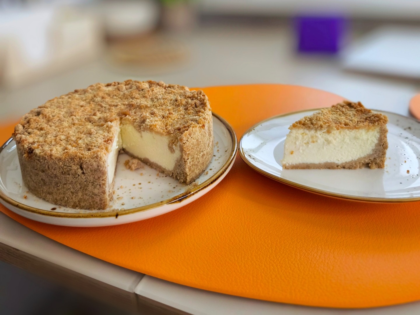 Сверху посыпьте пирог оставшейся крошкой. Выпекайте ватрушку в предварительно разогретой до 170°С духовке около 45 минут. Начинка должна хорошо схватиться, а верх зарумяниться. Точное время зависит от вашей духовки.