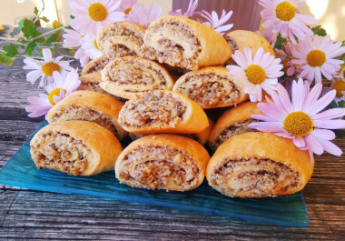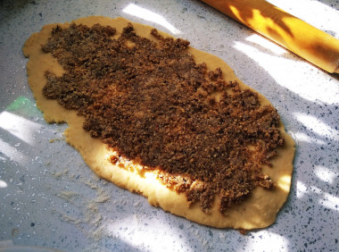 Каждый кусок теста сверните плотным рулетом по короткому краю.