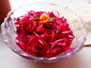 Прошло почти двое суток, как я приготовила закусочный салат с капустой и свеклой, пора пробовать! Хрустящий, сочный, вкусный , а самое главное - просто кладезь витаминов! А какой красивый и яркий- украшение любого стола! Для меня показалось, что количество сахара в рассоле можно немного уменьшить, но остальным моим дегустаторам очень понравилось. Спасибо ,Сибирячка !