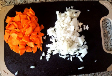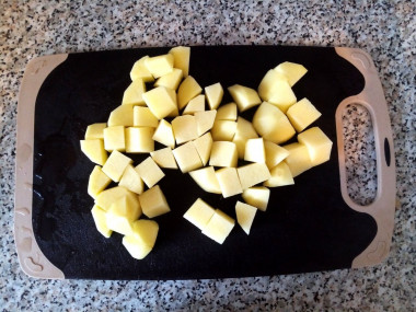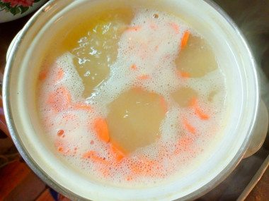 Почистите картофель и морковь, помойте их. Нарежьте морковь кольцами или полукольцами, картофель большими кусочками.