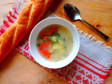 Купила замороженного морского окуня и решила кроме второго приготовить из него суп. Ориентировалась в приготовлении на рецепт ухи из головы морского окуня. Рыба была уже обезглавленная, поэтому бульон варила на хвостах. Поскольку хвостиков было всего четыре штучки (не очень-то и много), то и воды взяла меньше, полтора литра, чтобы бульон получился более наваристый. Сельдерея у меня не было, его ничем не стала заменять. Кроме моркови и картошки в готовый и процеженный бульон положила ещё рис, чтобы получилось сытнее.