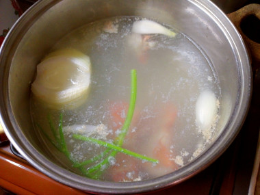 Залейте всё холодной водой и поставьте кастрюлю на сильный огонь, доведите до кипения. Как только бульон закипит, уменьшите огонь. Снимите появляющуюся пену. Варите бульон под крышкой на слабом огне около 30 минут. Затем снимите кастрюлю с огня и обязательно процедите готовый бульон, избавляясь от мелких косточек и использованных овощей, зелени и специй. С выбором кастрюли поможет статья по ссылке в конце рецепта.