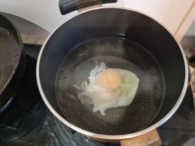 Сварите яйцо-пашот. Как сварить яйцо-пашот? Для этого в небольшой посуде доведите до кипения воду. Пусть она кипит не бурно, а небольшими пузырьками, для этого огонь сделайте минимальным. Вилкой закрутите воронку и быстро влейте яйцо, которое предварительно лучше разбить в чашку. Яйцо не трогайте до готовности, это где-то 4 минуты.