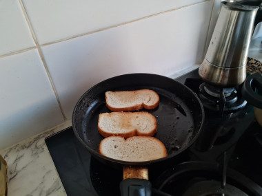Хлеб нарежьте на куски, если он продавался не в нарезке. Затем обжарьте его любым доступным способом: воспользуйтесь тостером, ростером или сковородой-гриль. Если нет гриля, то возьмите обычную сковороду.