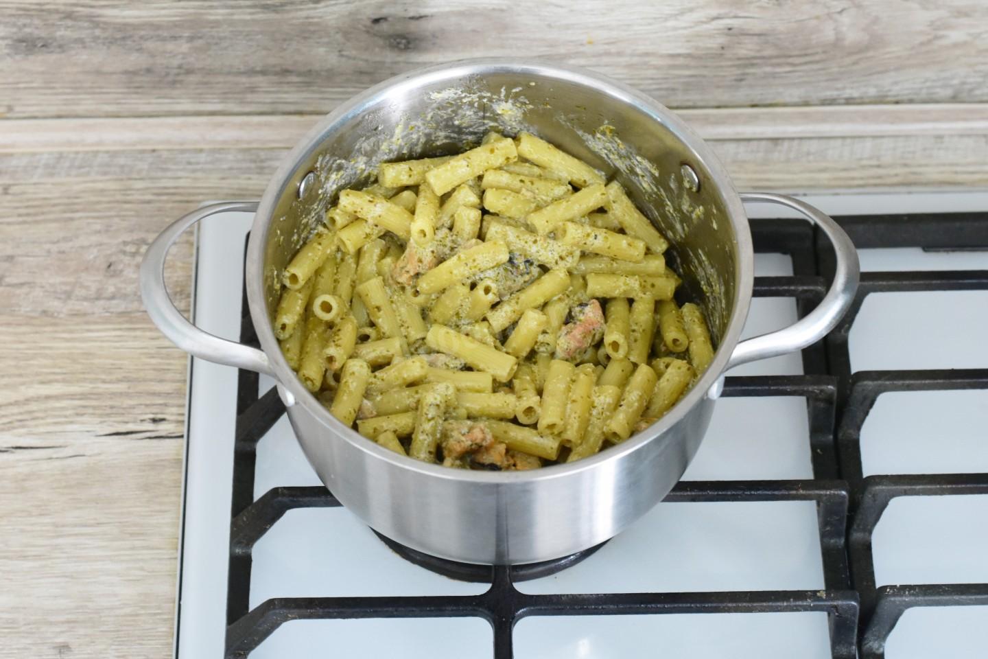В кастрюлю выложите соус песто, влейте сливки и доведите на медленном огне до кипения. Как выбрать кастрюлю для варки, читайте в отдельной статье по ссылке в конце рецепта. Добавьте пасту и мидии. Помешивая, прогрейте все вместе 2-3 минуты.