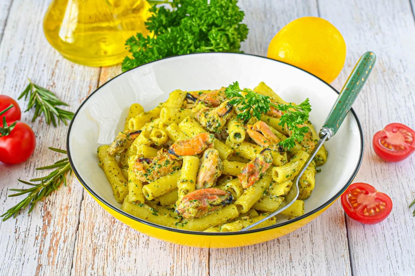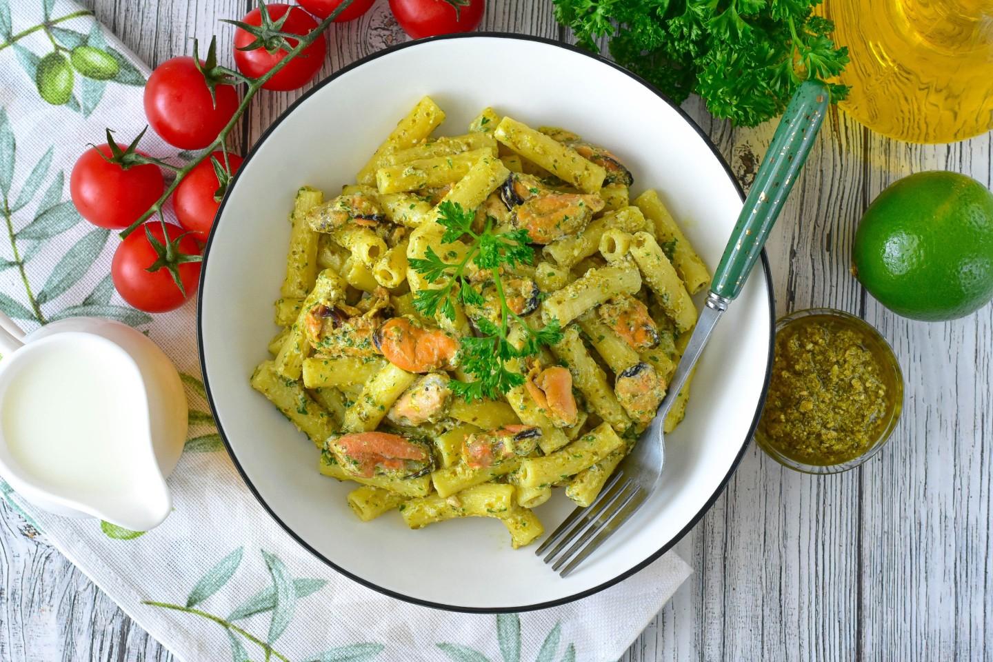 Сочетание пасты с морепродуктами — классика итальянского Средиземноморья. Интересно, что соус песто родом из Генуи, и его часто подают не только с пастой, но и в супах с морепродуктами. Наш рецепт — современная интерпретация этой традиции, где сливки делают вкус более нежным и привычным для славянской кухни, а мидии, доступные даже в замороженном виде, приносят "дух моря" в каждый дом.