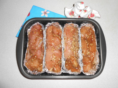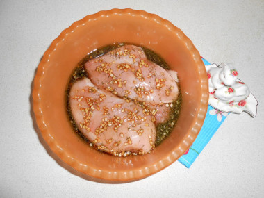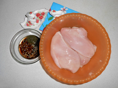 Положите куриное мясо в получившийся маринад, обмакните в него филе со всех сторон. Накройте крышкой или пищевой пленкой и оставьте в таком виде на 1 час.