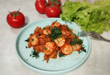 Приглянулся мне этот простой, но в то же время очень вкусный рецептик. Бывает, что надо срочно использовать сосиски в холодильнике, и как раз на выручку приходит этот рецепт))) Делаю тушёную капусту с сосисками не первый раз. Только я использую для этого мультиварку. Сначала пассирую морковку с луком на режиме 'Жарка' 5 минут, а потом для приготовления блюда использую режим 'Тушение'. На этот раз добавляла кетчуп 'Чили', так как томатного соуса не было, побоялась положить больше, чтобы блюдо не было сильно острым, положила 1 столовую ложку, поэтому капуста с сосискаии получилась не очень яркого цвета. Блюдо получается очень вкусным и мягким, с характерным запахом сосисок. Очень нравится! Мария, огромное спасибо за этот рецептик. Вот мой фотоотчетик)))