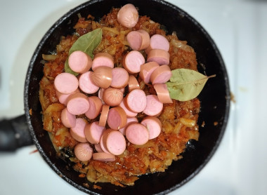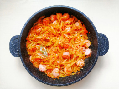 Высыпьте подготовленные сосиски к капусте и перемешайте. Тушите все вместе еще около 5 минут. Попробуйте капусту на вкус и при необходимости посолите, поперчите. Солить и перчить желательно в конце, так как после добавления томатной пасты и сосисок блюдо уже может не нуждаться в дополнительных специях. Многое зависит от степени солености томатной пасты и сосисок.
