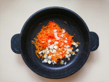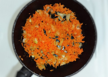 В глубокой сковороде с толстым дном разогрейте растительное масло. Выложите тертую морковь и жарьте на среднем огне (у меня режим 5 из 9) до мягкости около 5 минут. Если хотите добавить в капусту измельченный лук, то его следует выложить вместе с морковью. Как выбрать сковороду и масло читайте в отдельных статьях в конце этого рецепта.