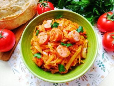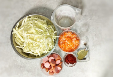 Как потушить капусту в сковороде с сосисками? Подготовьте все необходимые ингредиенты. Капусту берите сочную, по возможности свежую, не лежалую. Она должна быть ярко-зеленого либо белого цвета, без сильных потертостей, с упругими сочными листьями. Томатную пасту можете заменить на кетчуп. Помимо указанных в рецепте ингредиентов можете добавить одну мелко нарезанную луковицу.