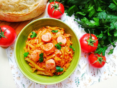 Вот решила приготовить мужу тушеной капусты и обязательно с сосисками. И лучка обязательно положила. Томатная паста придала такой насыщенный цвет, мне кажется я делала без неё когда то и зря. Тушила в общем не менее часа, водички добавила больше, не хватало ей. Какой аромат стоял к приходу мужа с работы, очень заманила такая вкуснятина своими запахами, рекомендую. Быстро и очень просто.