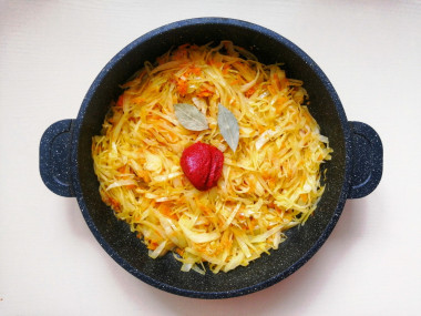 Добавьте к капусте томатную пасту, лавровый лист и душистый перец. Перемешайте и томите на слабом огне около 7 минут.