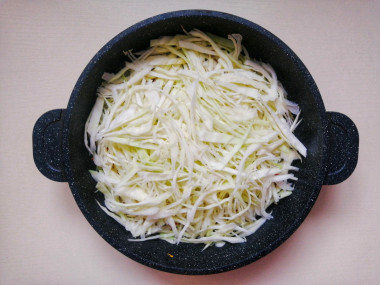 Добавьте капусту и тщательно перемешайте с морковью. Поначалу капуста занимает много места, но по мере тушения лишняя влага из нее испарится и слой капусты сильно осядет. Поэтому если вы видите, что в сковороду не помещается вся капуста, то добавляйте ее частями и по мере оседания добавляйте еще и перемешивайте.