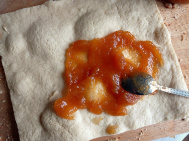 Смажьте первый корж яблочным повидлом. Сверху выложите второй корж, его также смажьте яблочным повидлом и присыпьте песочной крошкой.
