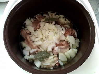 Мультиварку включила на программу "жарка" на 20 минут. За это время получилось обжарить две партии кусочков мяса. Затем все сложила обратно в чашу, засыпала луком, посолила и добавила лавровый лист для аромата. Воды добавила побольше, чтобы получить вкусную подливку. Далее тушила 1,5 часа.