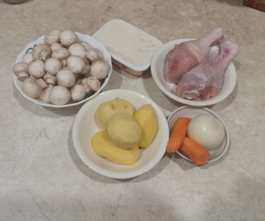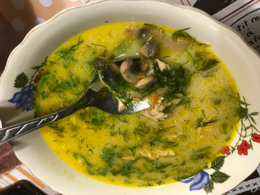 Сырнный суп получился очень вкусный. Хрустящие шаминьоны, плюс сливочный вкус - просто великолепно! Курица с грибами - отличное сочетание.