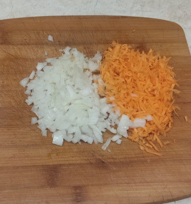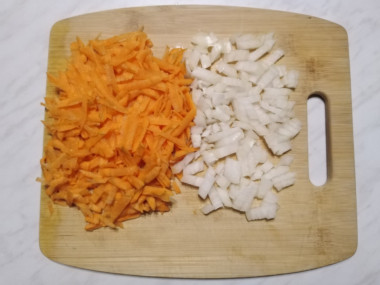Морковь вымойте и очистите от кожуры. Сполосните водой. Репчатый лук очистите от шелухи. Нарежьте лук мелкими кубиками, а морковь натрите на крупной терке.