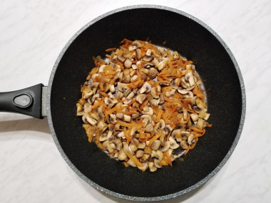 Выложите нарезанные грибы к луку и моркови и продолжайте жарить, но уже под крышкой. Грибы дадут много сока и уменьшатся в объеме.