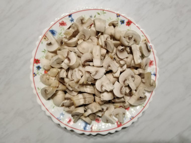Очистите и нарежьте шампиньоны. Если вы решили взять лесные грибы, предварительно отварите их.