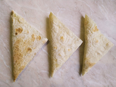 Продолжите складывать треугольник, пока не закончится лаваш. Можно сделать меньше слоев и остановиться, когда вся начинка окажется внутри. Тогда слой теста будет маленьким, и конверты получатся еще вкуснее.