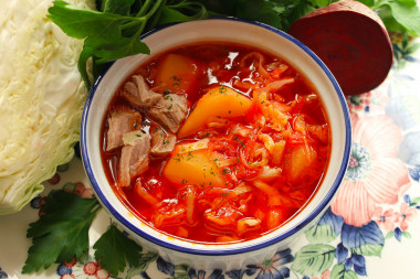 Бульон варила из свиной косточки с добавлением лука, моркови, петрушки и специй. Затем бульон процедила, а кастрюлю помыла. Мясо сняла с кости и разобрала на небольшие кусочки. Овощи измельчила привычным способом: картошку нарезала средними кусочками, лук мелким кубиком, капусту лапшой, а морковь и свеклу натерла на крупной тёрке. Зажарку потушила до мягкости. Сахара и томатной пасты положила в половину меньше по своему вкусу.