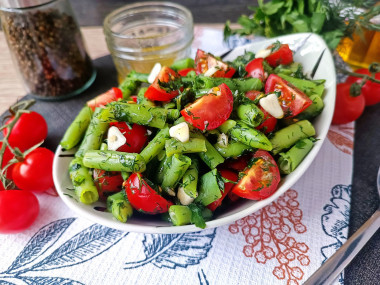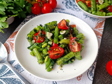 В салатнике смешать стручковую фасоль, помидоры, измельченную зелень и чеснок. Полить салат заправкой и перемешать.