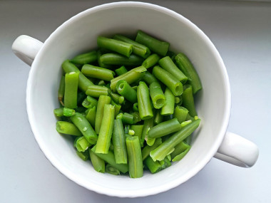 Стручковую фасоль выложить в кипящую подсоленную воду и отварить в течение 3 минут. Если фасоль замороженная - предварительно разморозить.