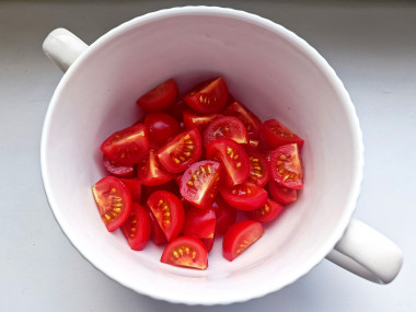 Помидоры вымыть, обсушить и нарезать небольшими кубиками.